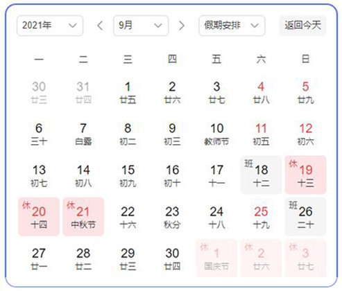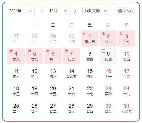 2021年10月1日(星期五)至10月7日(星期四)放假調休,共7天,
